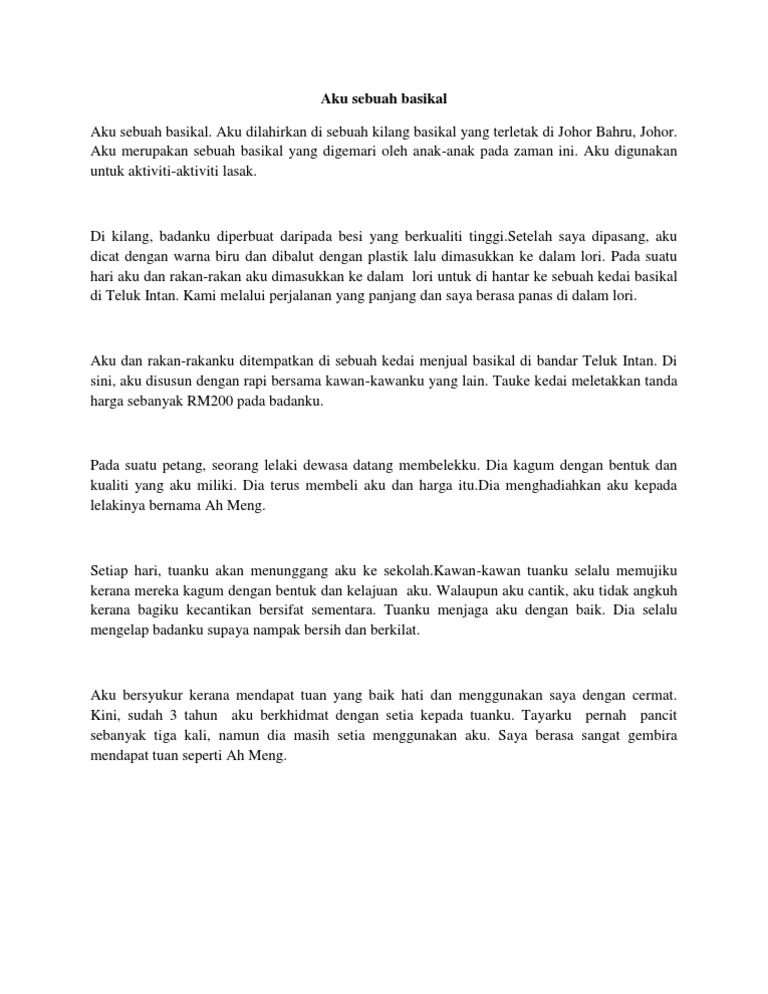 Contoh Karangan Aku Sebuah Basikal Aku ialah sebuah basikal yang berjenama Dorris. Aku dibuat di sebuah kilang besi waja yang tidak besar. Setelah siap saya dihantar.