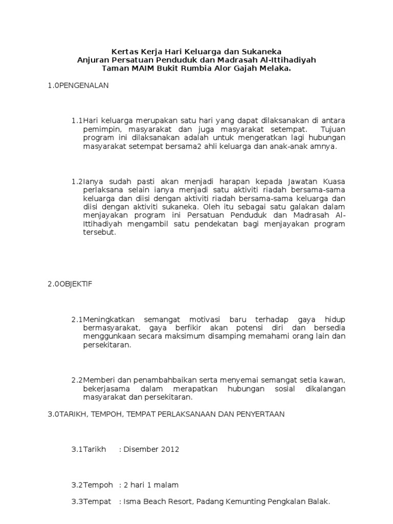 Kertas Kerja Hari Keluarga dan Sukaneka Anjuran Persatuan Penduduk dan Madrasah Al-Ittihadiyah Taman MAIM Bukit Rumbia Alor Gajah Melaka. Kertas Kerja Kempen Membasmi Denggi. Kertas kerja ini dikemukakan dengan tujuan untuk mendapatkan persetujuan daripada Guru Besar untuk mengadakan aktiviti sukaneka pada 28 Julai 2010 pada hari latihan kokurikulum.